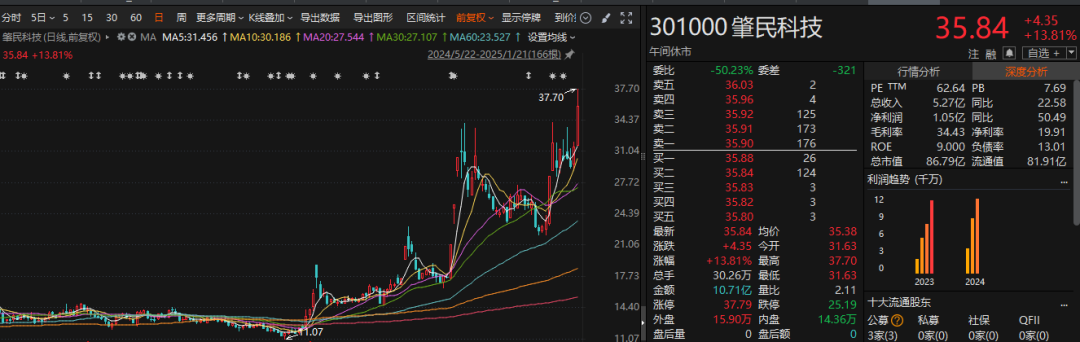 肇民科技发布的最新业绩预告显示,预计2024年实现净利润1.39亿元—1.55亿元,净利润同比增长35%—50%。公司不断开发新产品,全力扩张市场份额和产品价值量,努力提升产品的性能、品质,项目定点和新客户不断增加,尤其在新能源车零部件市场不断取得新的突破,应用于多个国内外知名品牌新能源车的定点产品陆续进入量产阶段,利润比上年同期有所增长。