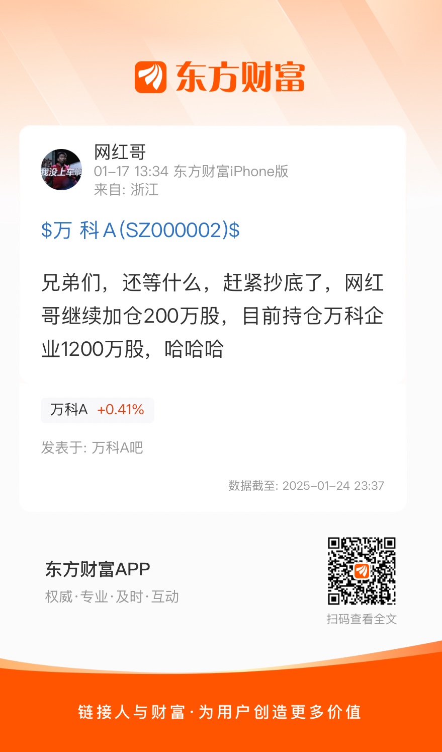 兄弟们,还等什么,赶紧抄底了,网红哥继续加仓200万股,目前持仓万科企业1200万股,哈哈哈