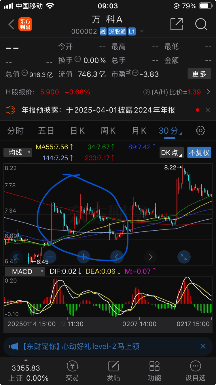 $万 科A(SZ000002)$ 目前股价自60分钟级别红色均线上方(涨停)回落,趋向下方黄、绿短期均线组合——比左侧30分钟级别那里的均线态势要上扬一些,所以后续调整幅度也没那么剧烈。并且,大盘及大多数个股,我个人感觉也是如此,后面几天没行情,但跌幅也不算大。