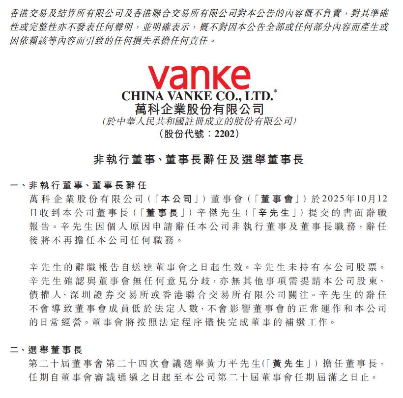 万科企业在港交所公告称,公司董事长辛杰因个人原因提交书面辞职报告。第二十届董事会第二十四次会议已选举黄力平担任董事长。