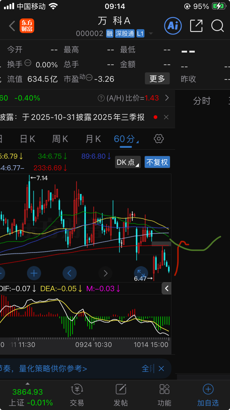 $万 科A(SZ000002)$ 按目前60分钟级别均线态势看,最迟两个交易日内A型右侧筑底成功转涨——等股价涨过横置的红色均线,趋势就总体反弹了(没画底部横盘)