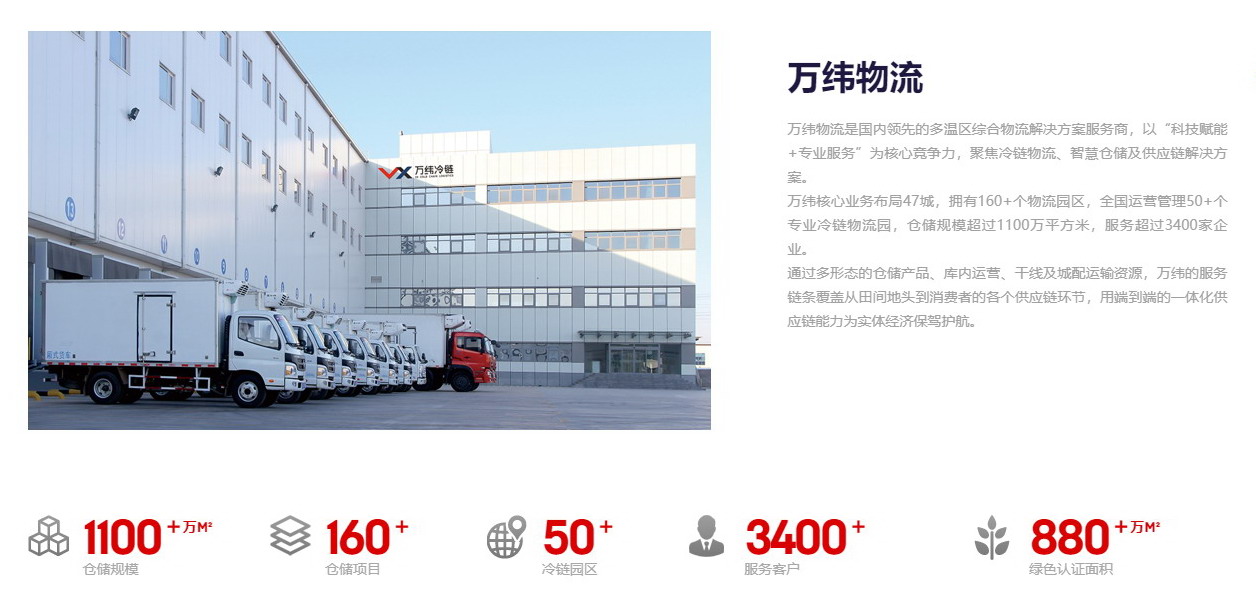 万纬物流是国内领先的多温区综合物流解决方案服务商,以“科技赋能+专业服务”为核心竞争力,聚焦冷链物流、智慧仓储及供应链解决方案。