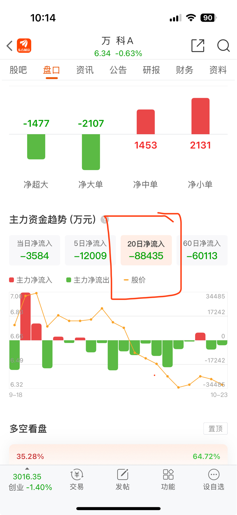$万 科A(SZ000002)$ 20天跑8个亿,没有资金进来,一路下跌,5块见