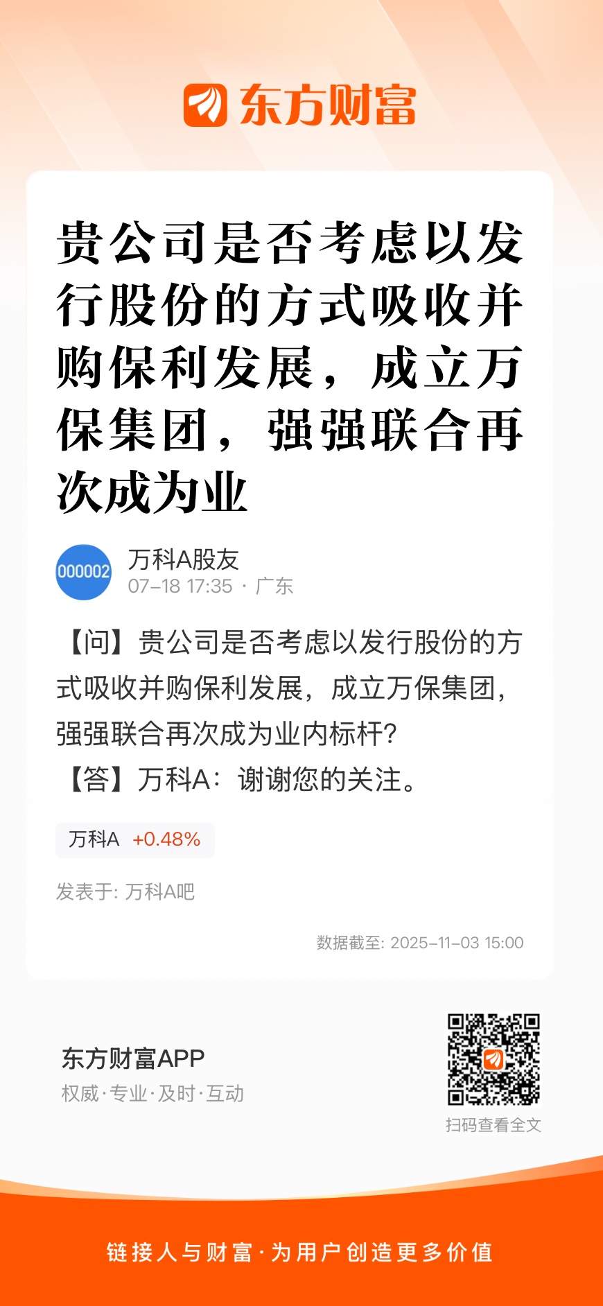 贵公司是否考虑以发行股份的方式吸收并购保利发展,成立万保集团,强强联合再次成为业内标杆?