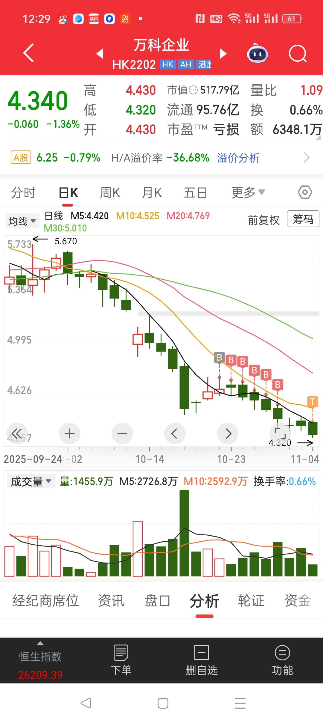 $万 科A(SZ000002)$ 服气了,从重仓卖掉2/3,本来以为低点赚点走人呢。结果满仓亏大了。怎么也没想到八连阴,明天差不多也是阴