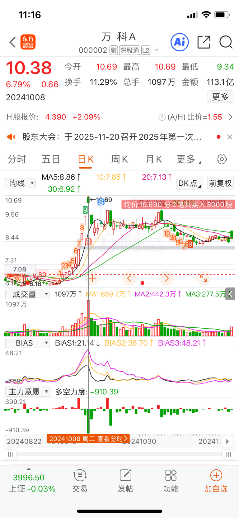真正的再晚一分钟就买不到这么贵的万科了,新股民第一支股票。第二天就割肉了。