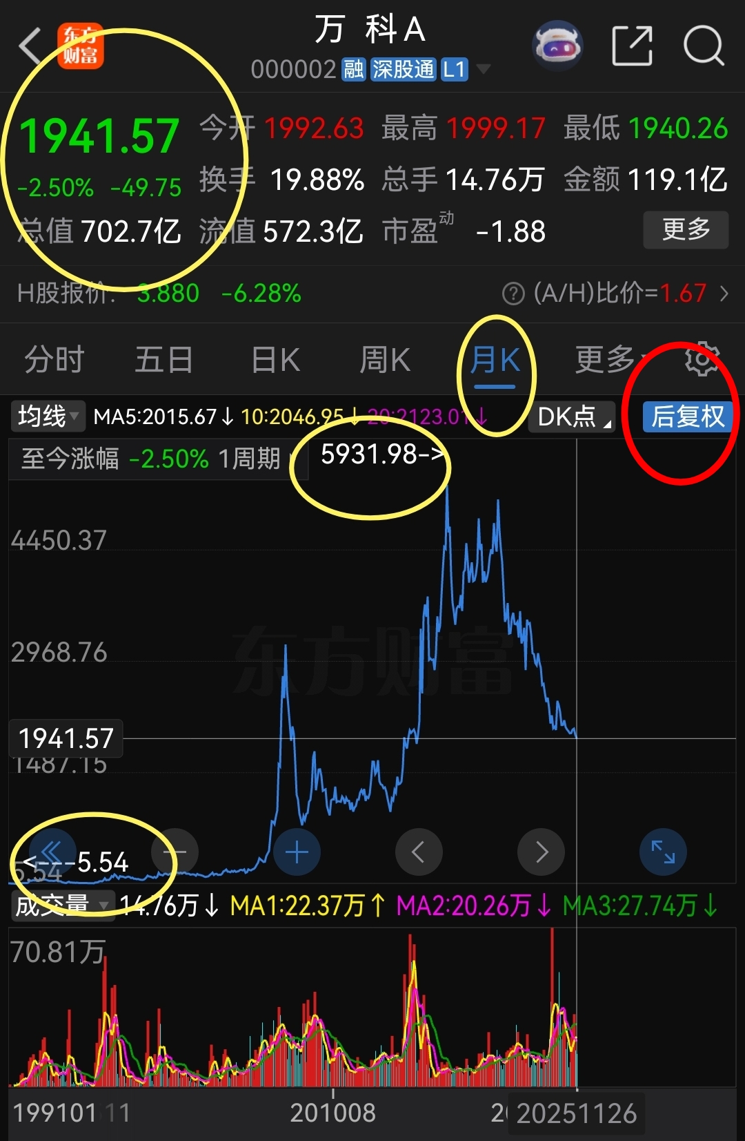 回看房地产界的优等生--万科,月K线图的复满权(后复权)今天的收盘价!仔细看清楚