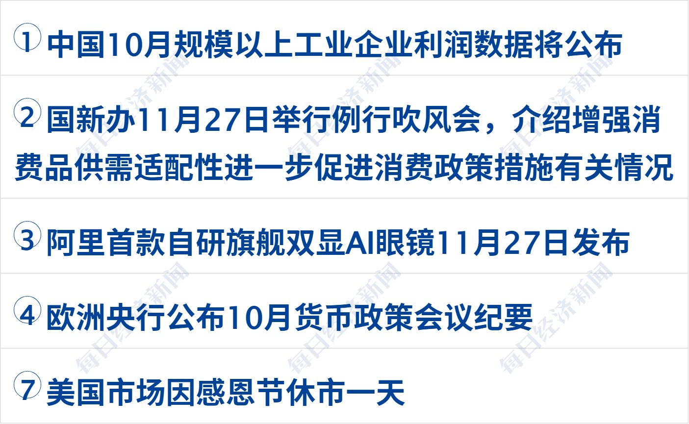 11月27日,美联储发布的经济褐皮书报告显示,美国经济活动近期几乎陷入停滞,美国政府关门影响消费者决策。美国制造业和零售业普遍面临投入成本压力,主要反映关税导致的价格上涨。一些辖区指出保险、公用事业、技术和医疗保健成本上升。少数企业指出,AI取代了入门级职位,生产率提高抑制新招聘需求。