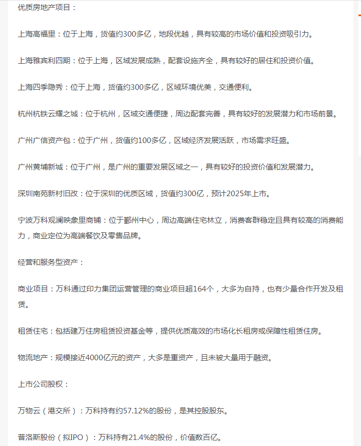 这就是万科目前的资产,真要破产,还真是不容易,就看管理层舍不舍得变现还债了