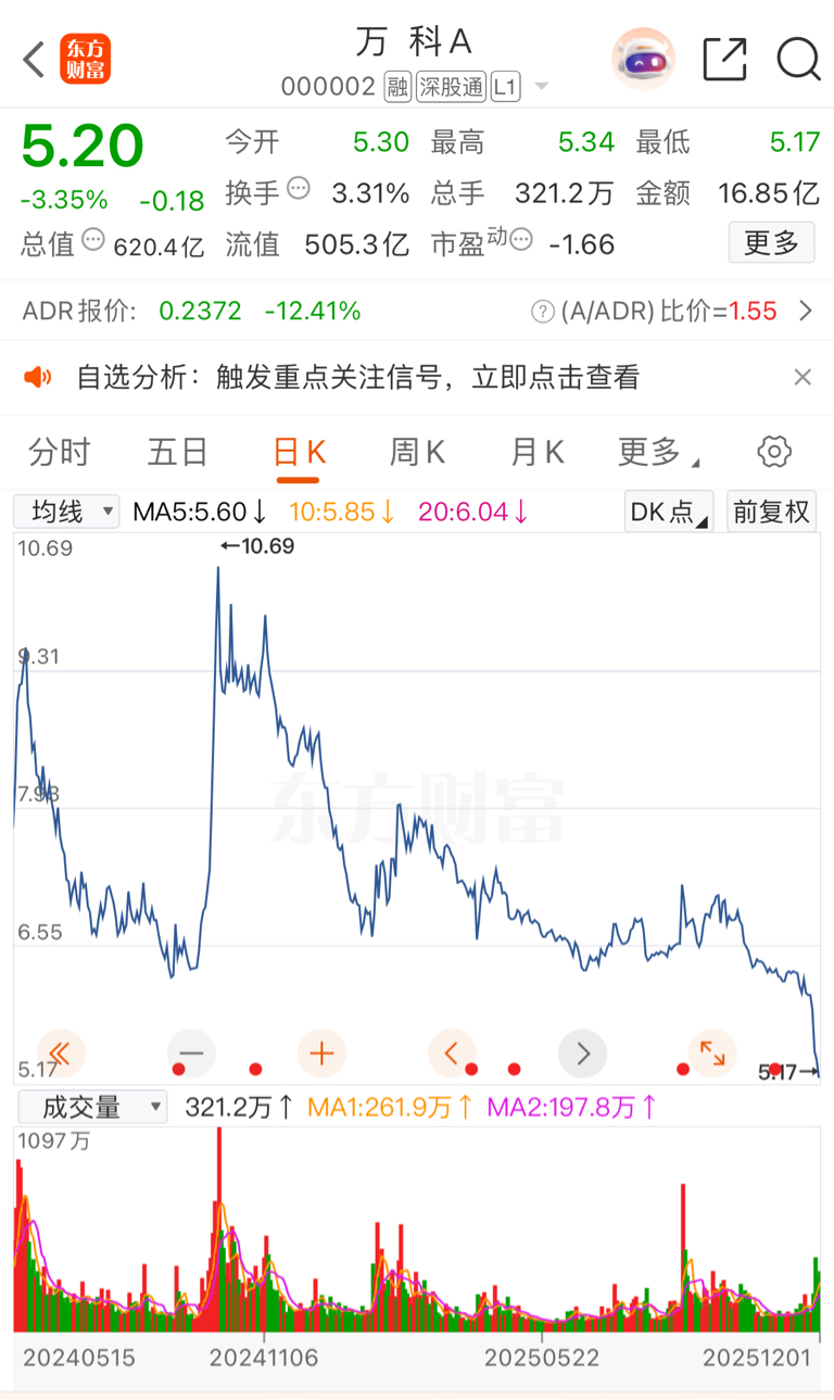 当万科A股今日收盘价定格在5.20元,这份特殊的数字密码,是写给52万散户股民最深情的告白,更是对坚守价值者最真诚的致敬。在股价创十年新低的低迷行情里,市场的恐慌情绪或许遮蔽了企业的真实底色,但时间终将印证:做好人、买好股,终会迎来岁月馈赠的好报。