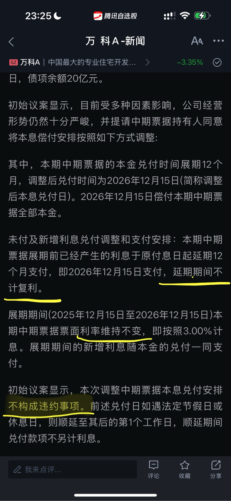 $万 科A(SZ000002)$ 展息初步落地,展息一年 不计复利,不算违约。 条件比较友好。明天利空落地,值的期待,终于松口气。