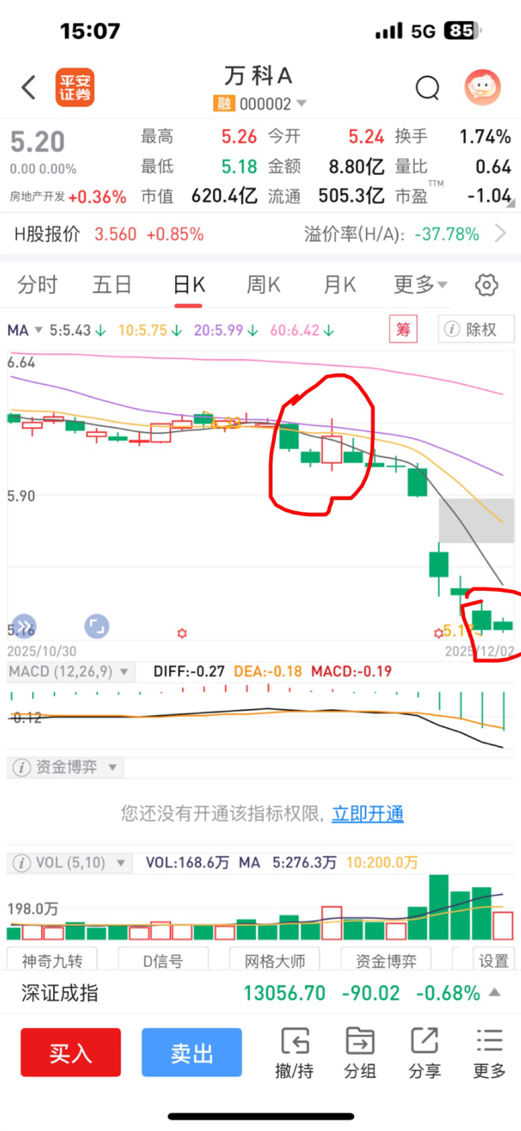 $万 科A(SZ000002)$ 止跌,等到大阳线冲高回落离场!
