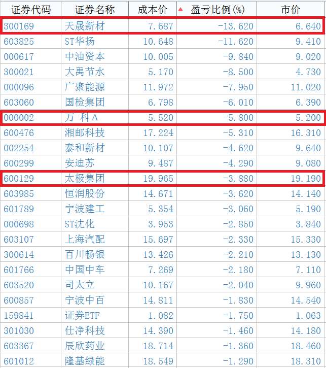 目前手中亏钱的货,红框股相对重仓,万科绝对重仓。
