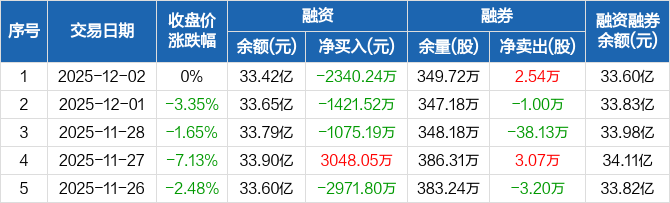 万科A融资融券信息显示,2025年12月2日融资净偿还2340.24万元;融资余额33.42亿元,较前一日下降0.7%。