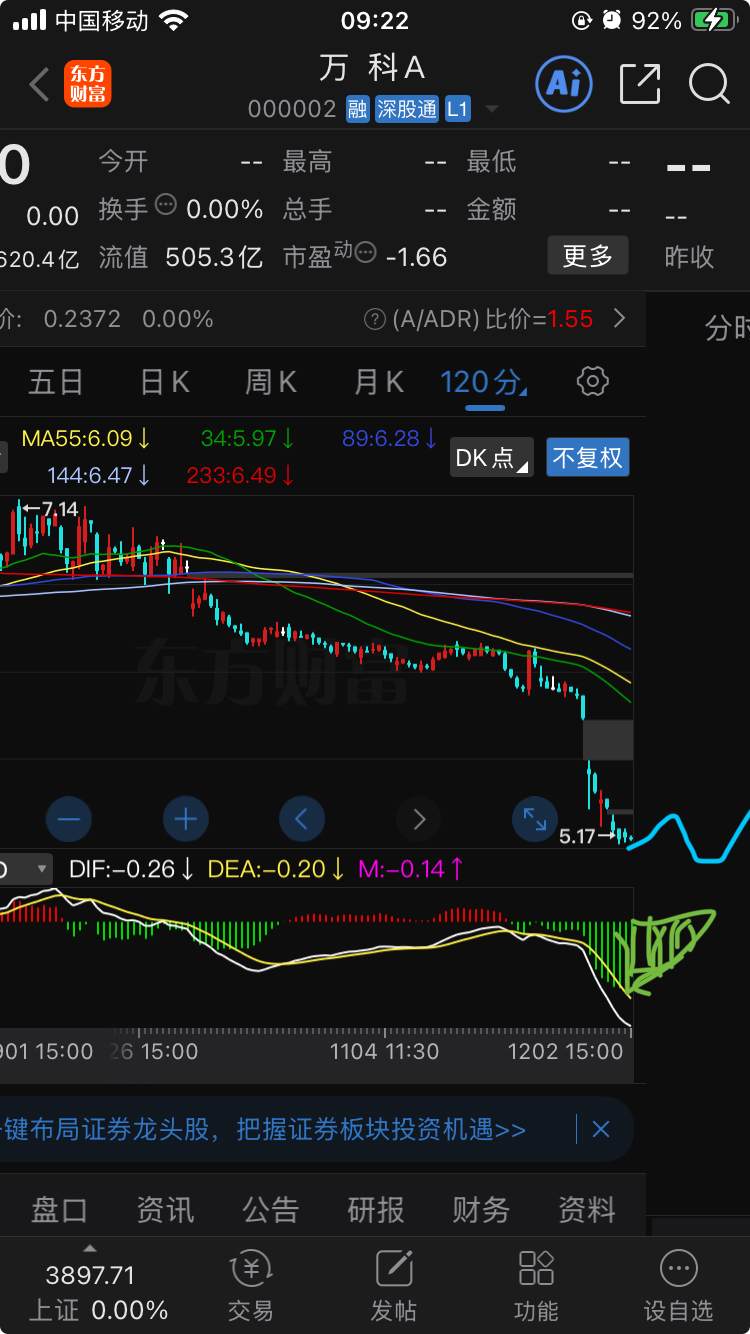 $万 科A(SZ000002)$ 120分钟级别均线态势是双层瀑布型下甩,说明下跌惯性大;对应的下方macd 形态看——可能要绿柱区回缩消失后才见底