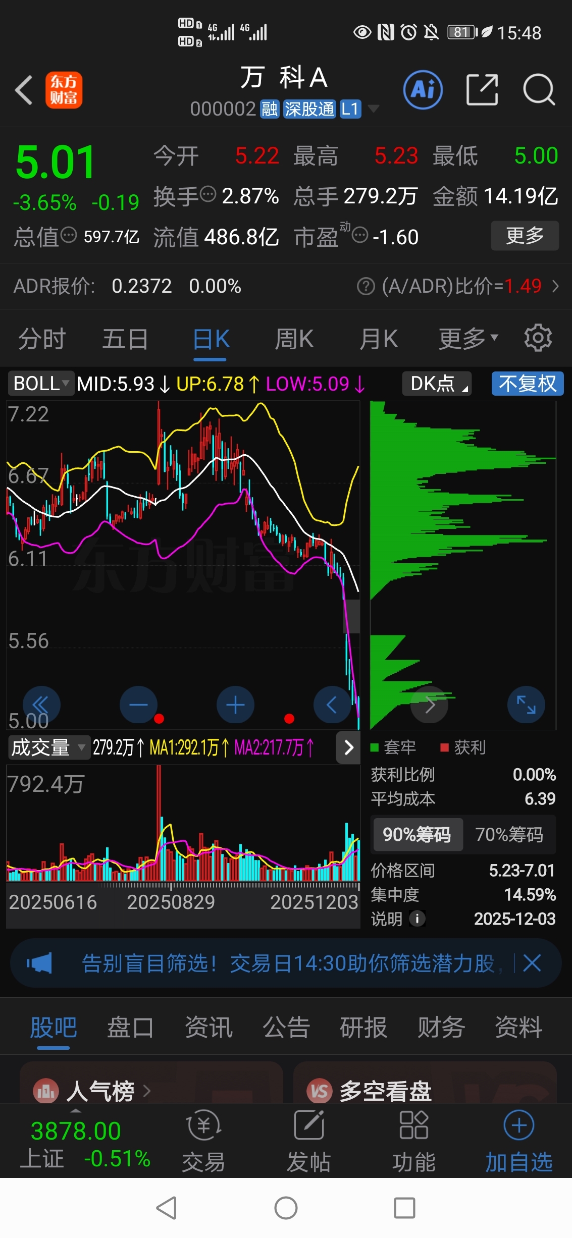 $万 科A(SZ000002)$ 获利比例0,90%筹码5.2-7.01,融资盘扛不住了,多杀多开始演绎……