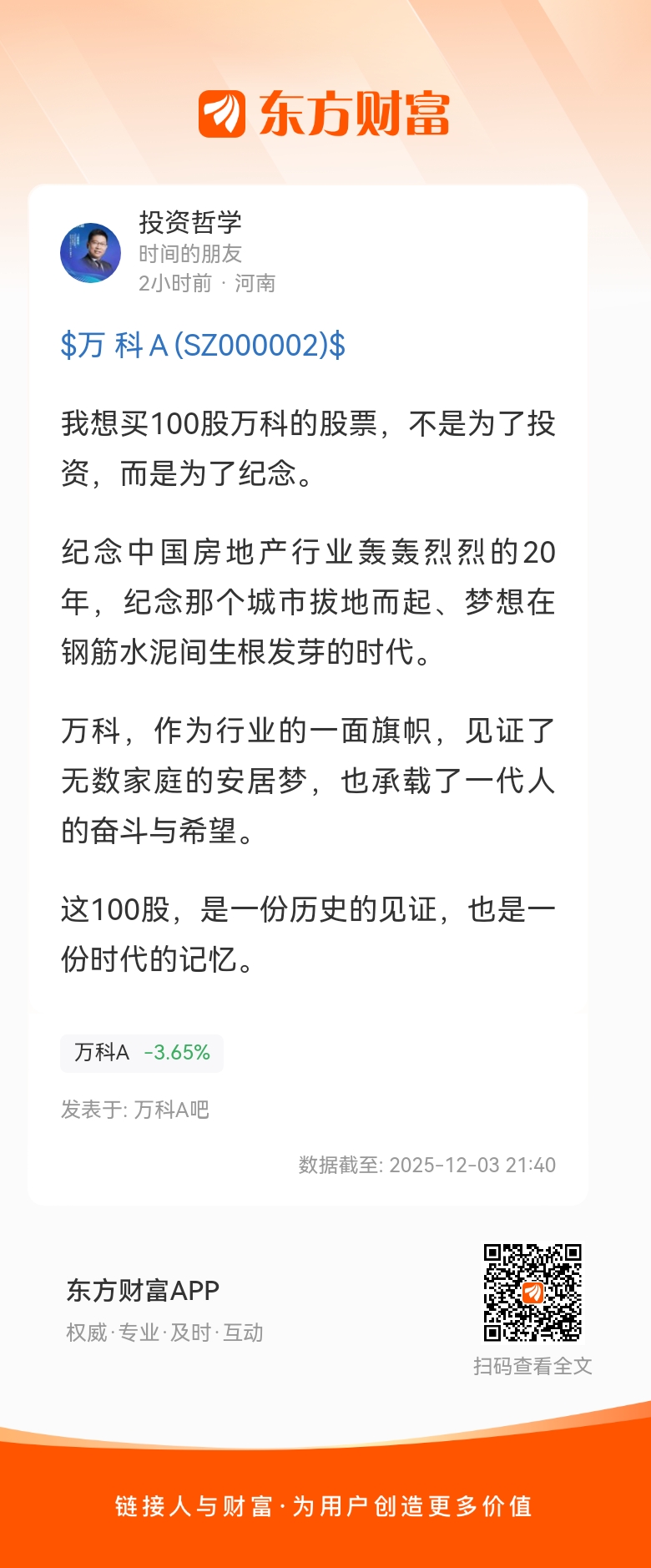 我想买100股万科的股票,不是为了投资,而是为了纪念。