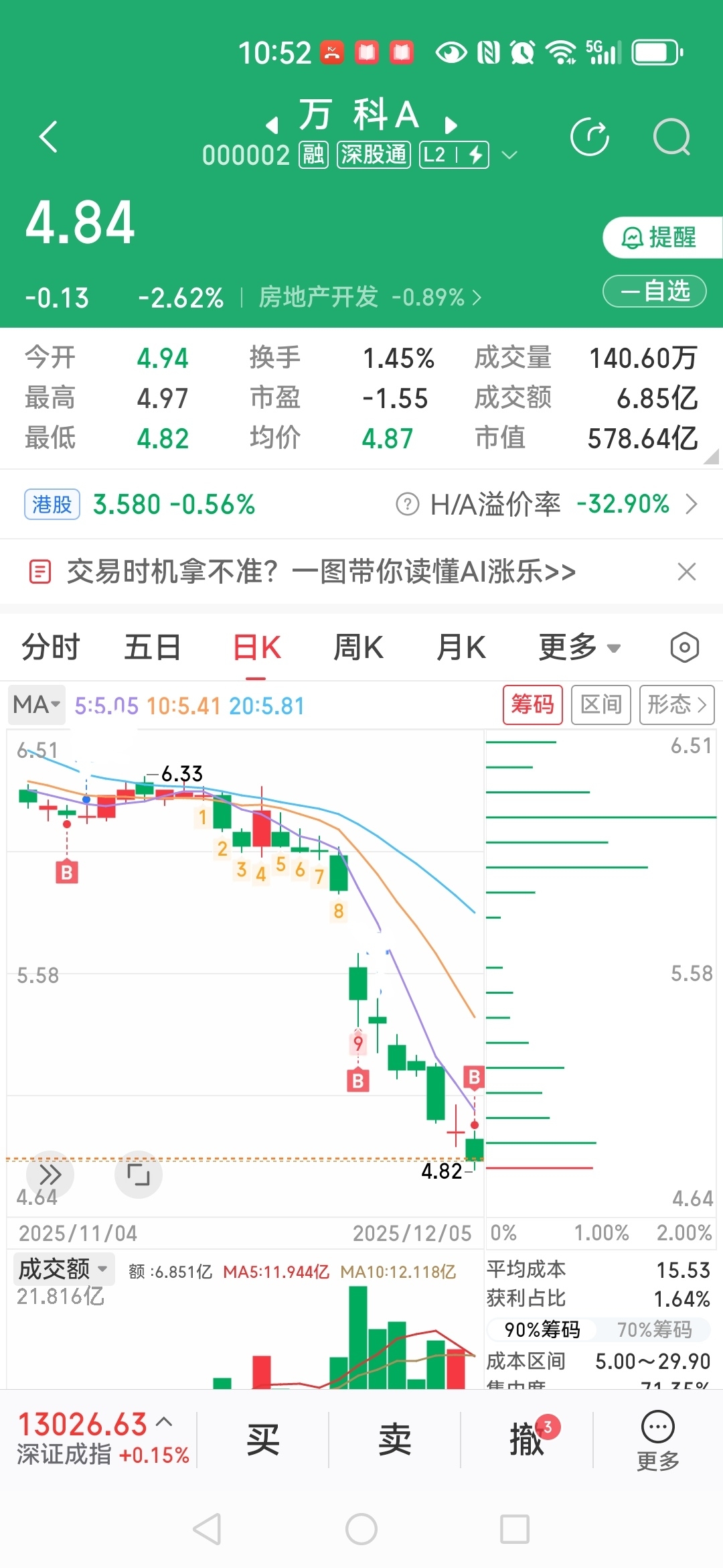 $万 科A(SZ000002)$ 能回本吗最高6.18买的,今天4.86满仓共36万股