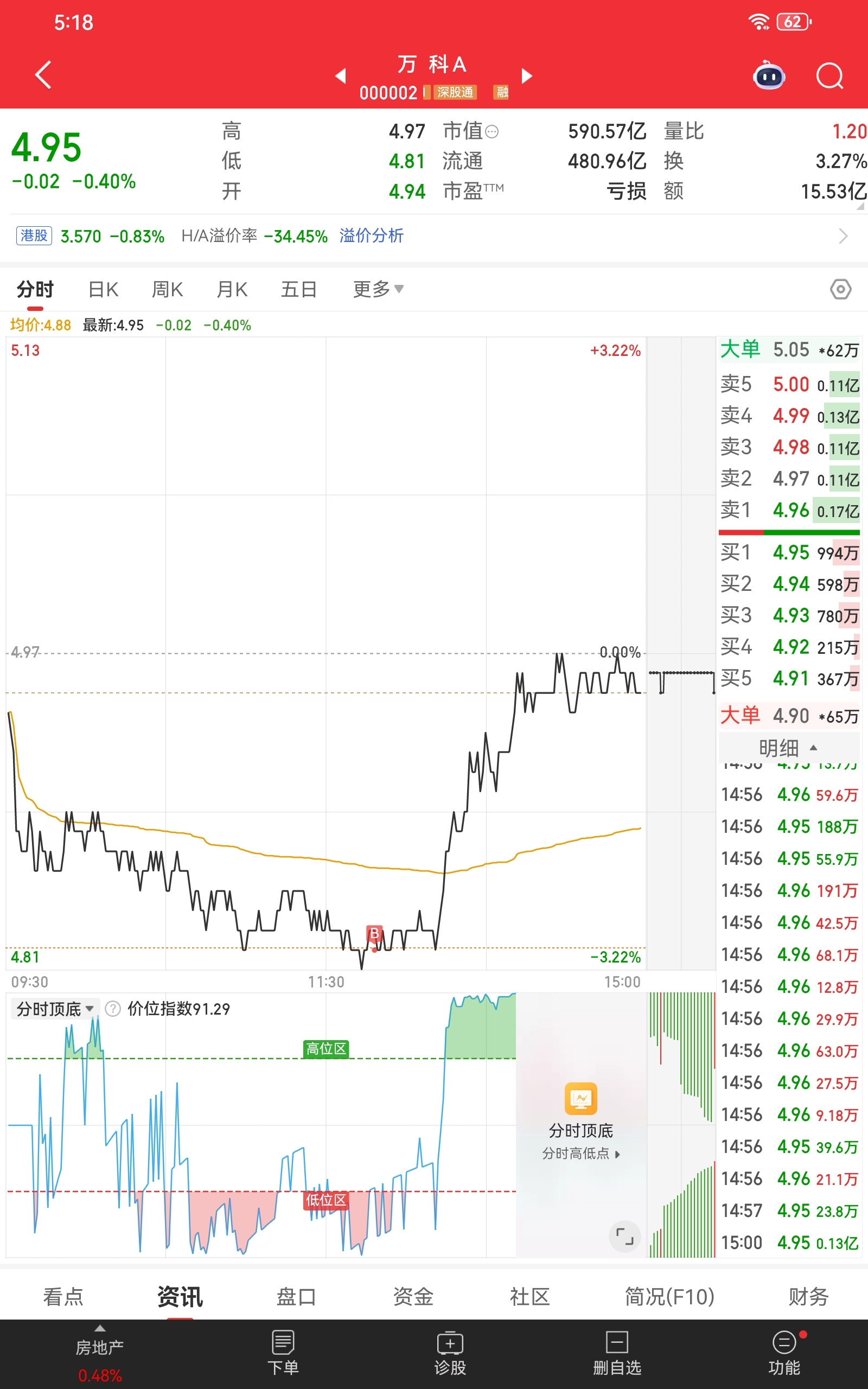 4.82买了点万科,感觉这里还不是底,以前6.7买过,现在一下子少了2块钱,买了