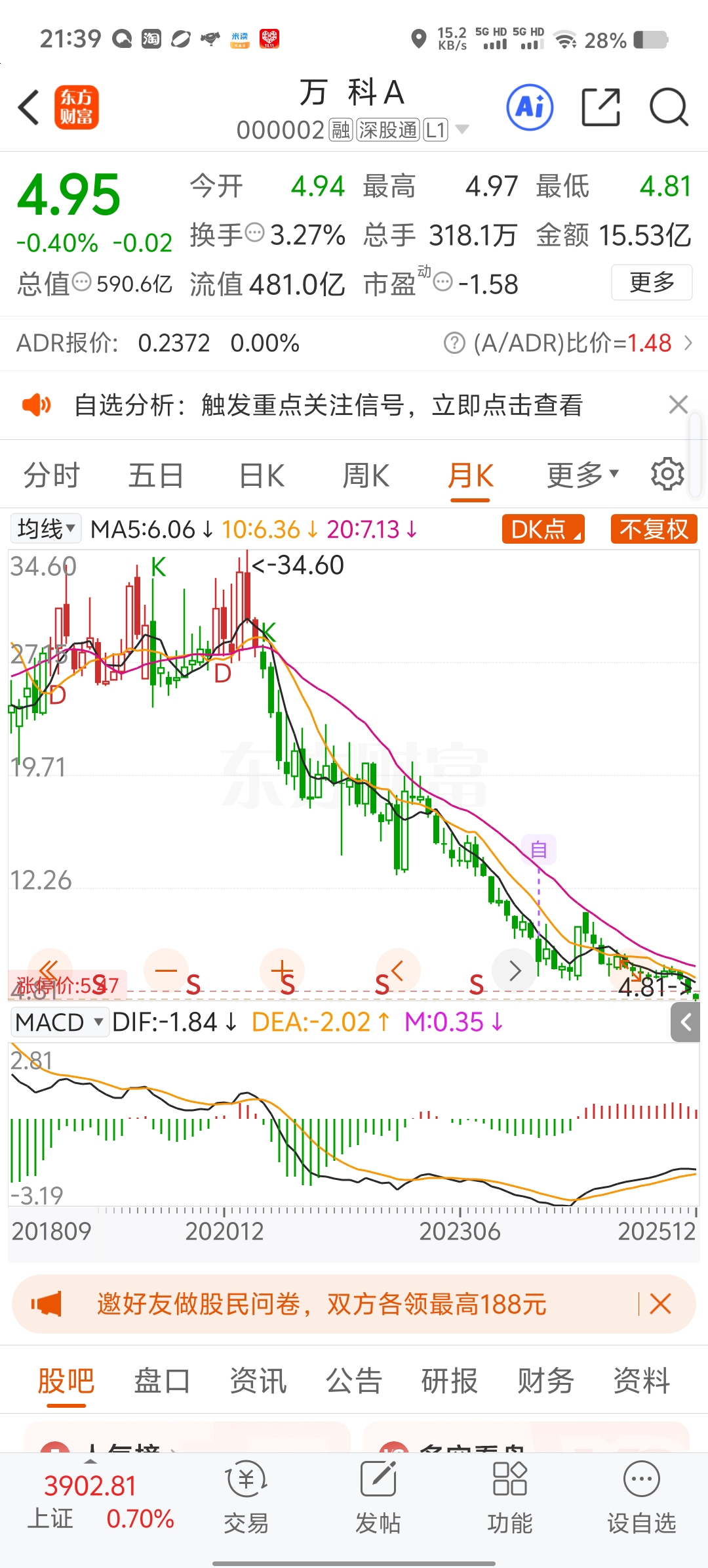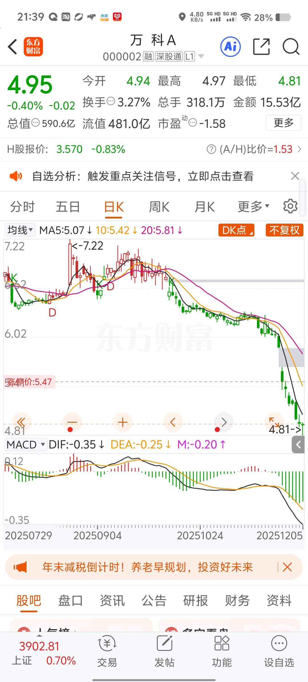 $万 科A(SZ000002)$ 好票啊,兄弟们姊妹们,我的目标三块四,关键还有比较远的路没到,估计明年4月中会到。今天这走势,感觉有一波弱反弹要来了!