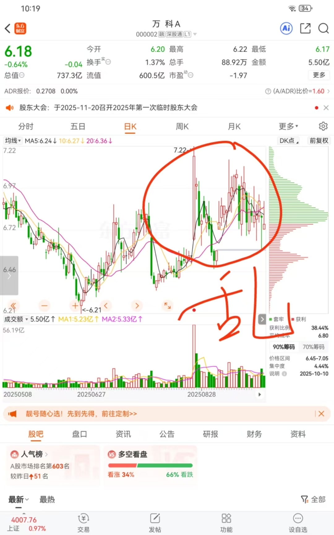 $万 科A(SZ000002)$ 这股之前一段时间我就觉得奇怪,上蹿下跳的,像吸筹又觉得不对劲,因为主力吸筹不会这么明显,所以这个位置就是在出货让散户进场,后面走势果然印证了我的猜想