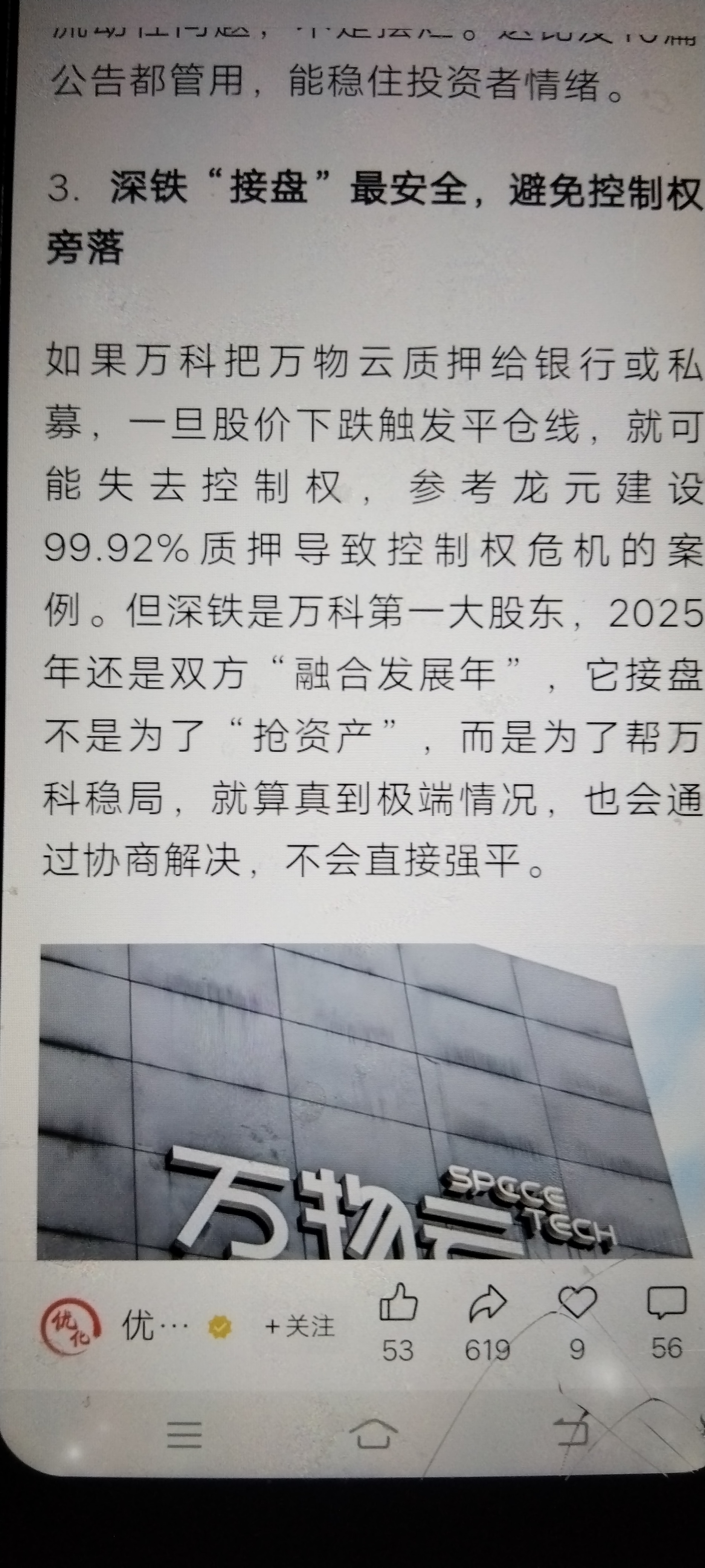 深铁借款三年,万科已经上岸了,万物云抵押大股东是利好,避免优质资产落入银行保险手里被平仓风险