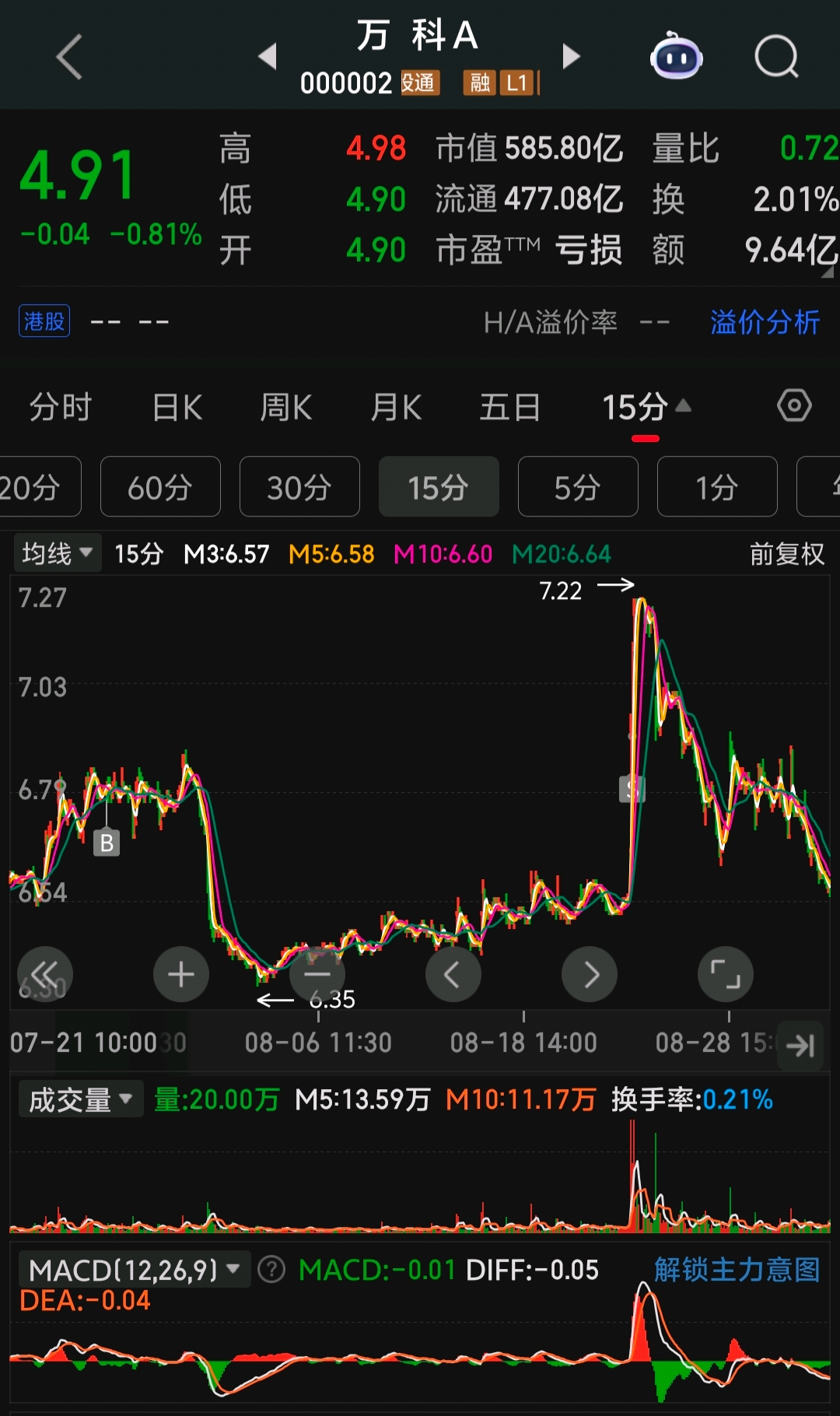 $万 科A(SZ000002)$ 万科,我的买点当时是因为突然放量,然后明显大资金进去,后期缩量调整了半个月,我在涨停板顺利解套出货,现在看看多么的凶险,君子不立危墙之下,真的是选择比努力重要。选错了板块,真的会让人痛不欲生,就算再努力,大环境不行也无法避免被割的情况。但愿持仓的各位战友能熬到一个连板都顺利吃肉走人。大盘震荡,继续空仓中