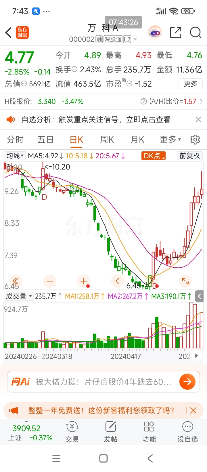 $万 科A(SZ000002)$ 图形跟这里很像,要是复刻走势的话,搞不好还要跌5天