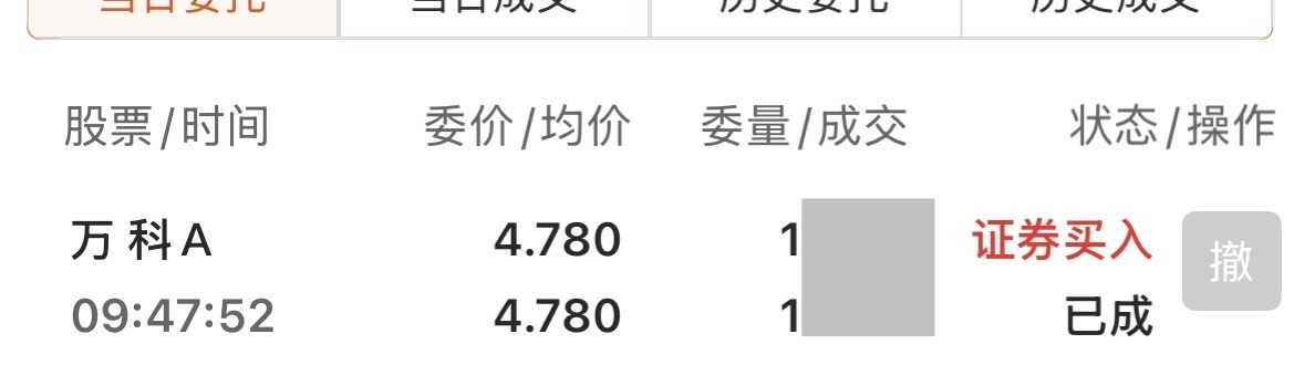 试试水,第一次购买万科,万科不会倒,人缓则安,事缓则圆,时间会证明一切