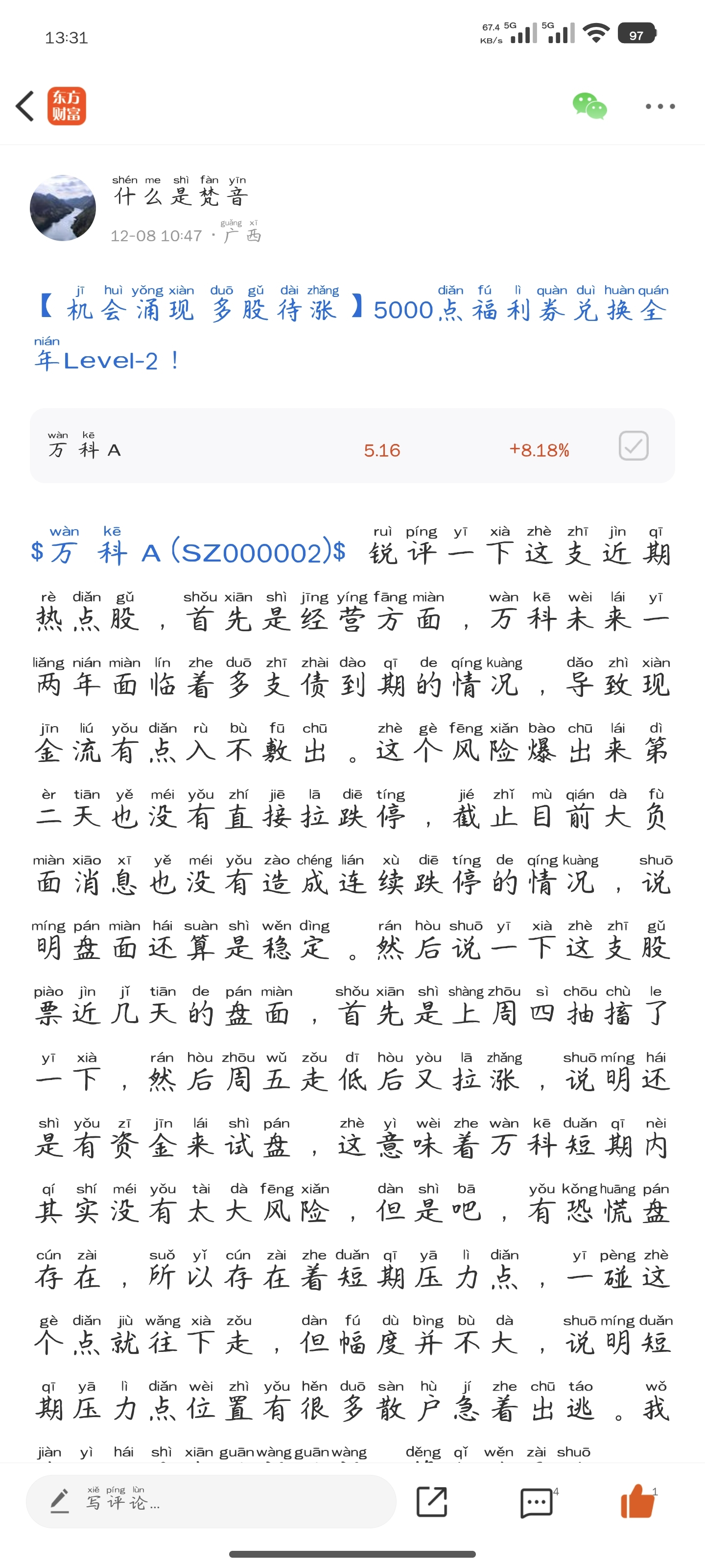 $万 科A(SZ000002)$ 12月8号那天,我说已有资金来试盘说明潜在风险不大。预测没错,接下来就看企稳状态了,今天拉涨停是不错的开头