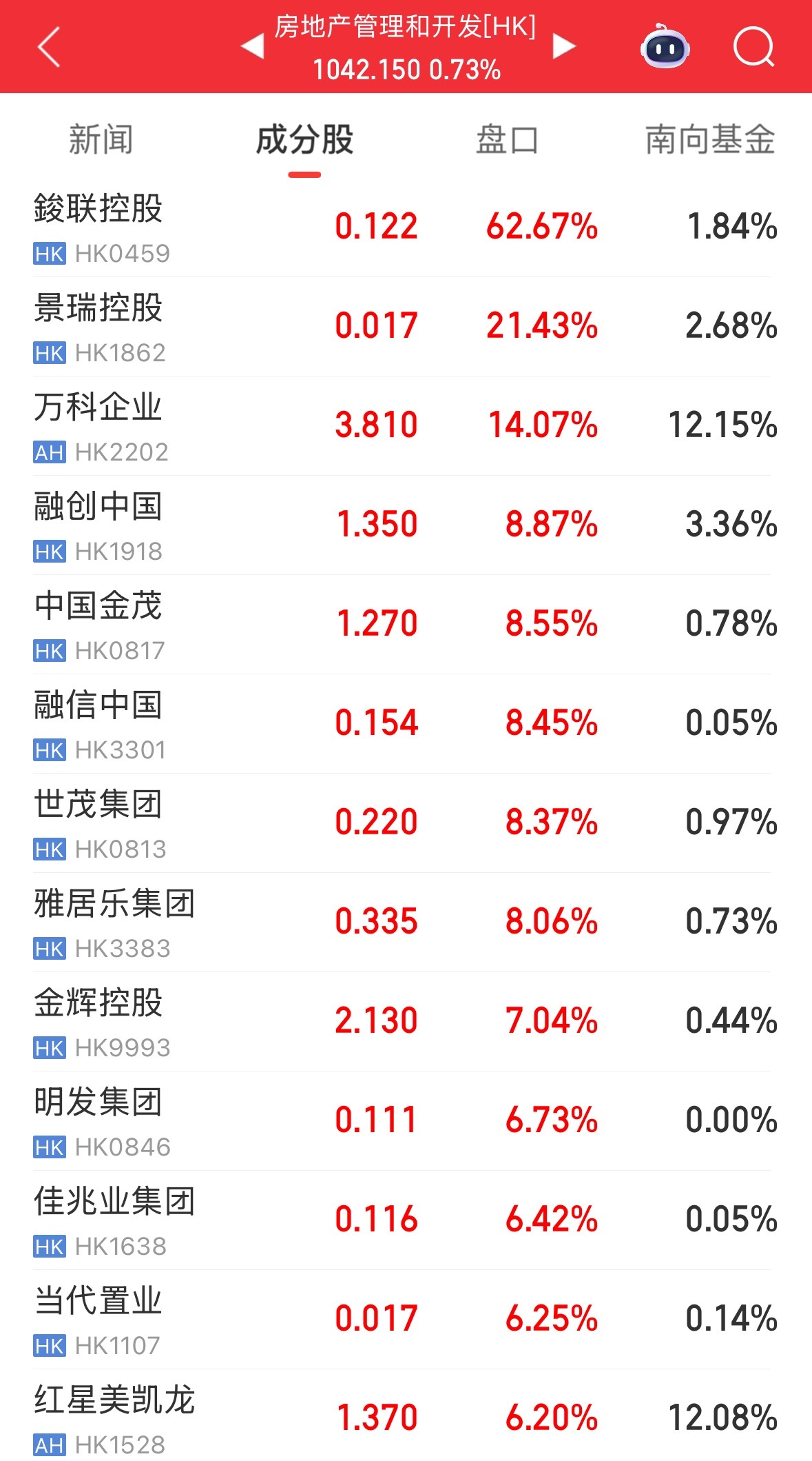 此外,港股内房股走高,万科企业涨超14%,融信中国、融创中国、世茂集团。中国金茂涨超8%。