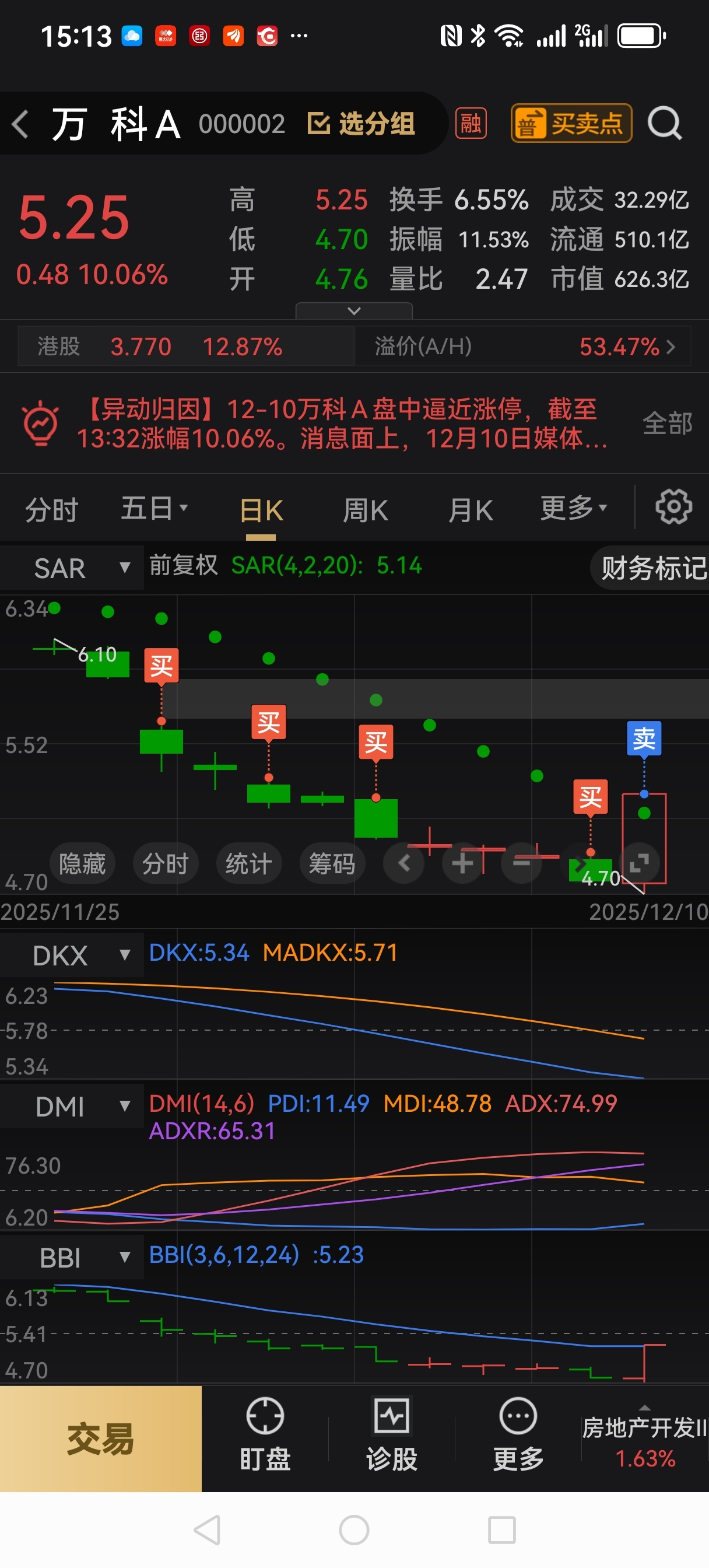 万科A,12月10号,原已挂5.25,怕了,怕成交不了,撤单改挂5.18,已清仓