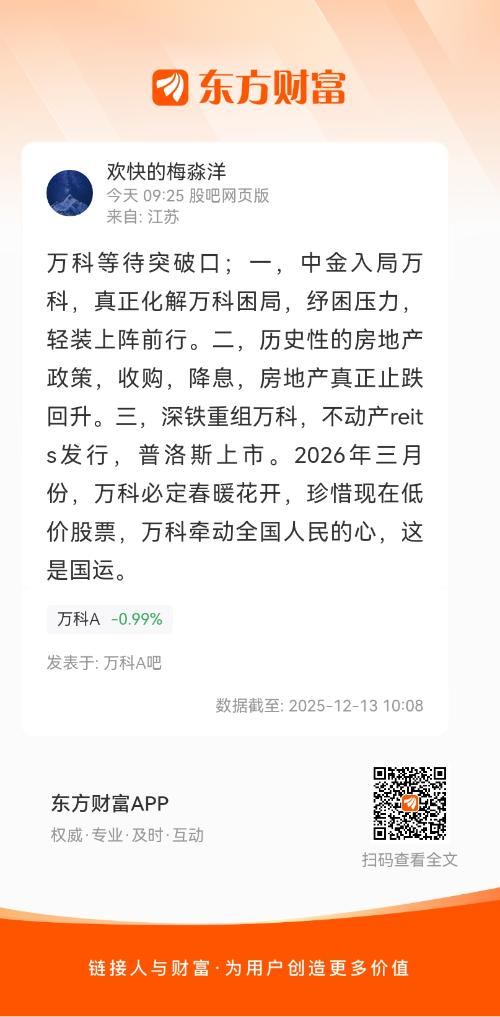 万科等待突破口;一,中金入局万科,真正化解万科困局,纾困压力,轻装上阵前行。二,历史性的房地产政策,收购,降息,房地产真正止跌回升。三,深铁重组万科,不动产reits发行,普洛斯上市。2026年三月份,万科必定春暖花开,珍惜现在低价股票,万科牵动全国人民的心,这是国运。