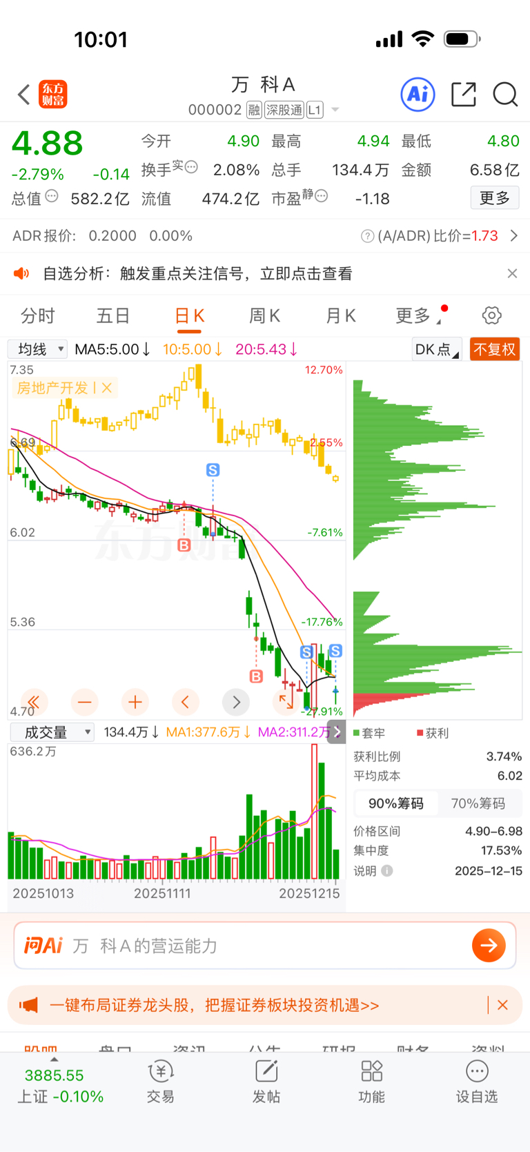 $万 科A(SZ000002)$ 扛不住了,亏了16个点。可能倒在黎明前也可能倒在半山坡,亏10个点的时候就准备斩仓结果不信邪变成加仓。我不准备和趋势作对了。祝留下的发财