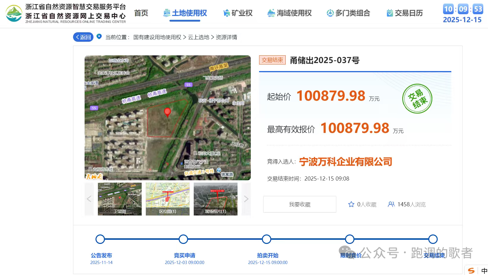 2025年12月15日,万科浙江宁波10.09亿元拿地成功