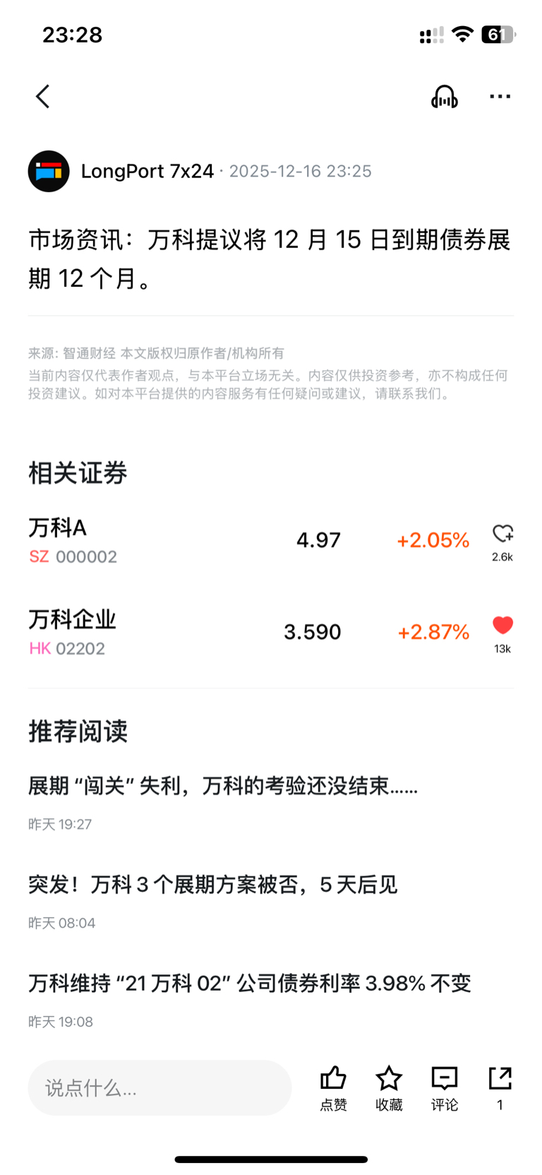 $万 科A(SZ000002)$ 明天要涨停板了