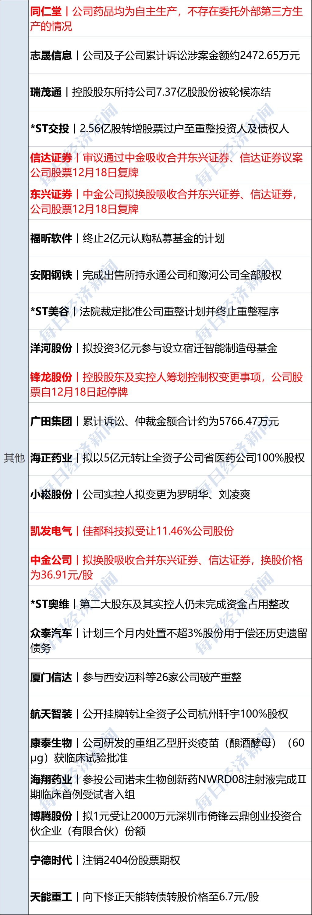 华谊兄弟(SZ300027,股价2.17元,市值60亿元):12月17日晚,华谊兄弟公告称,公司收到股东杭州阿里创业投资有限公司(简称“阿里创投”)和马云出具的相关文件,获悉阿里创投于12月17日减持公司股份,导致阿里创投及其一致行动人马云的权益变动触及1%及5%的整数倍,阿里创投的持股比例由3.467799%下降至2.403580%,阿里创投及其一致行动人马云的持股比例由6.064215%下降至4.999996%。本次变动之后,阿里创投及其一致行动人马云不再是华谊兄弟持股5%以上股东。