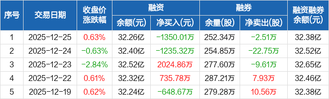 万科A:融资净偿还1350.01万元,融资余额32.26亿元(12-25)
