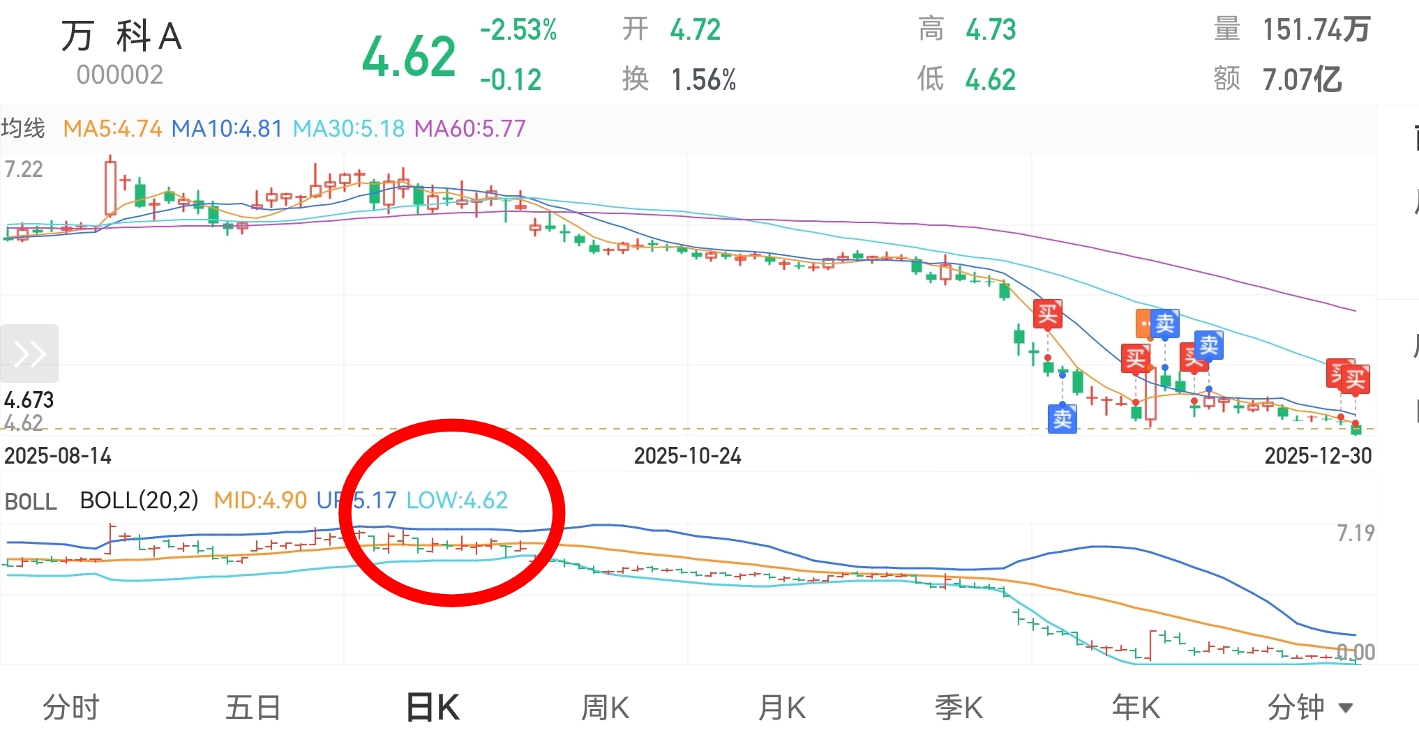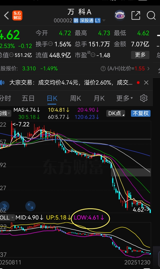 东财的日K线图中布林线下轨价为4.61元误差一分钱!反抽一触即发!拭目以待!