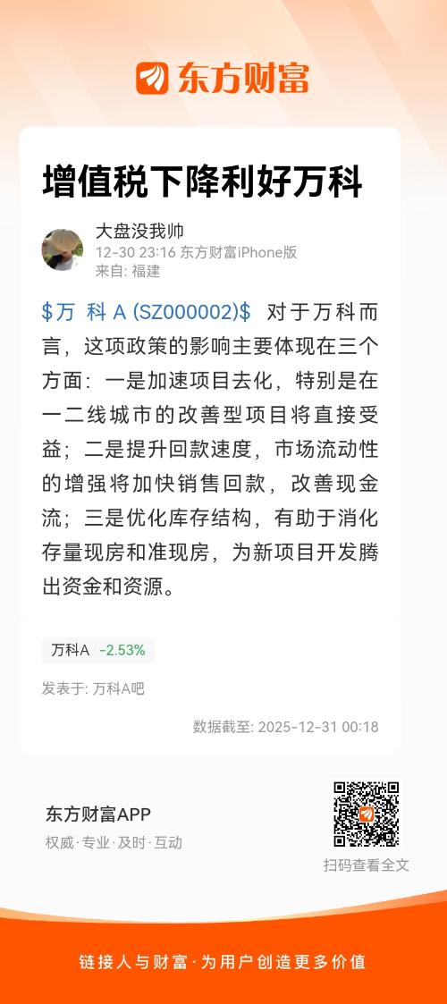 $万 科A(SZ000002)$ 对于万科而言,这项政策的影响主要体现在三个方面:一是加速项目去化,特别是在一二线城市的改善型项目将直接受益;二是提升回款速度,市场流动性的增强将加快销售回款,改善现金流;三是优化库存结构,有助于消化存量现房和准现房,为新项目开发腾出资金和资源。