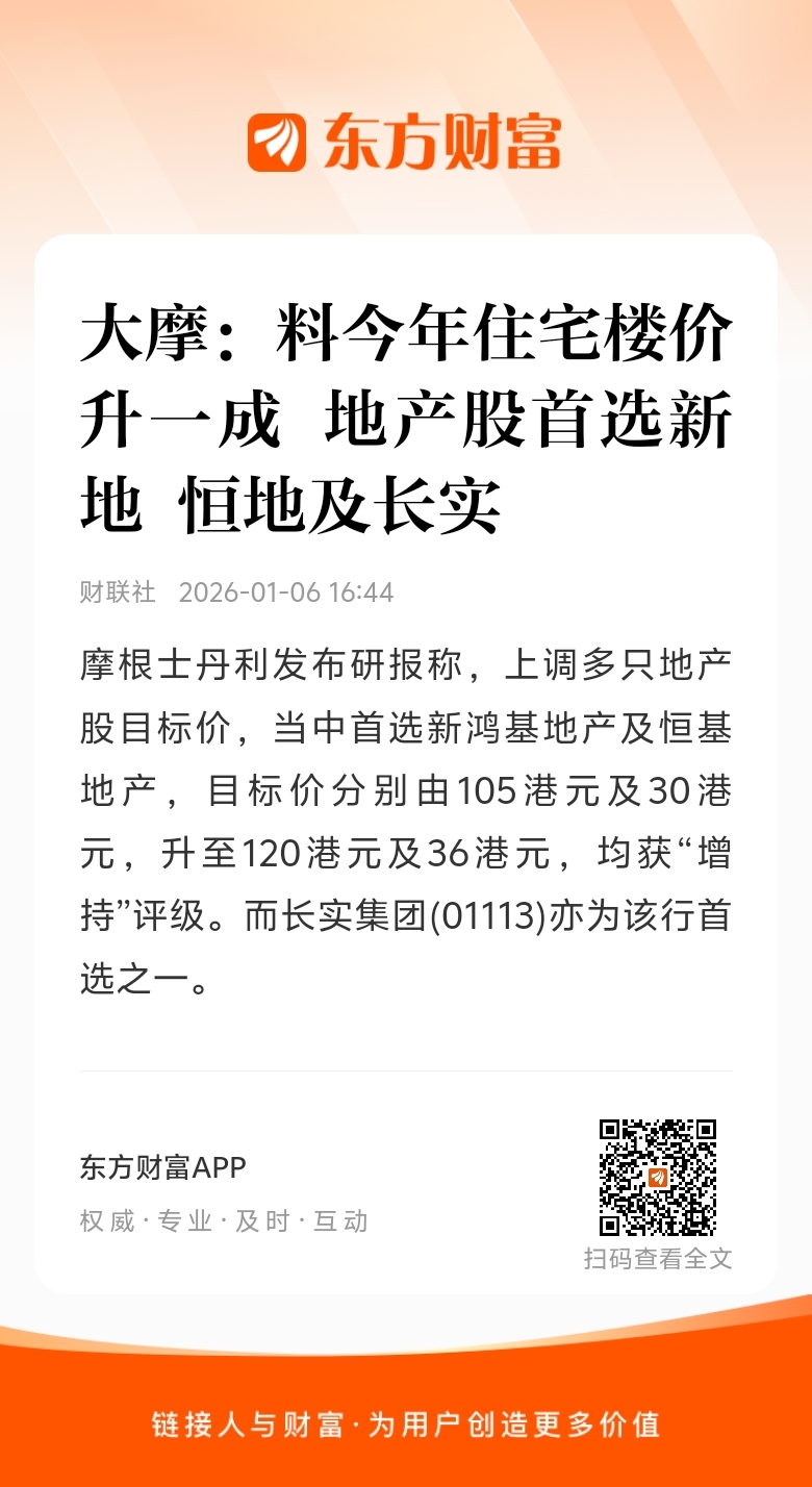 $万 科A(SZ000002)$ $保利发展(SH600048)$ $绿地控股(SH600606)$ 大摩:料今年住宅楼价升一成 地产股首选新地 恒地及长实。