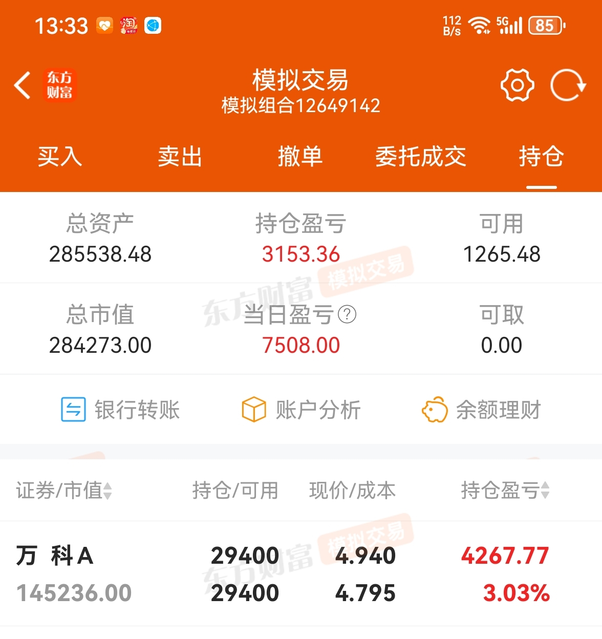 老子模拟买入的万科赚钱了,体验一把纸面富贵