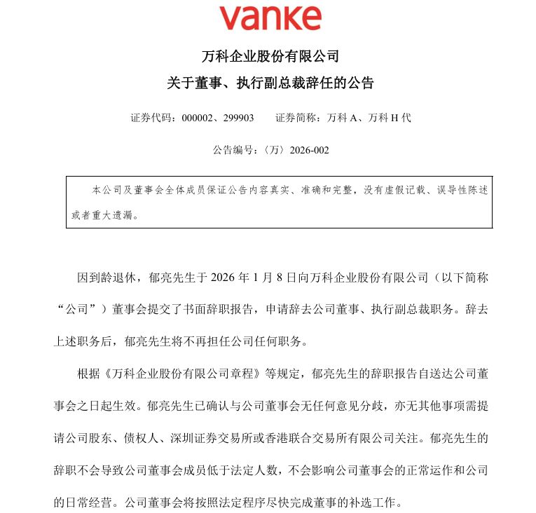 1月8日,万科A发布公告称,因到龄退休,郁亮先生于2026年1月8日向万科企业股份有限公司(以下简称 “公司”)董事会提交了书面辞职报告,申请辞去公司董事、执行副总裁职务。