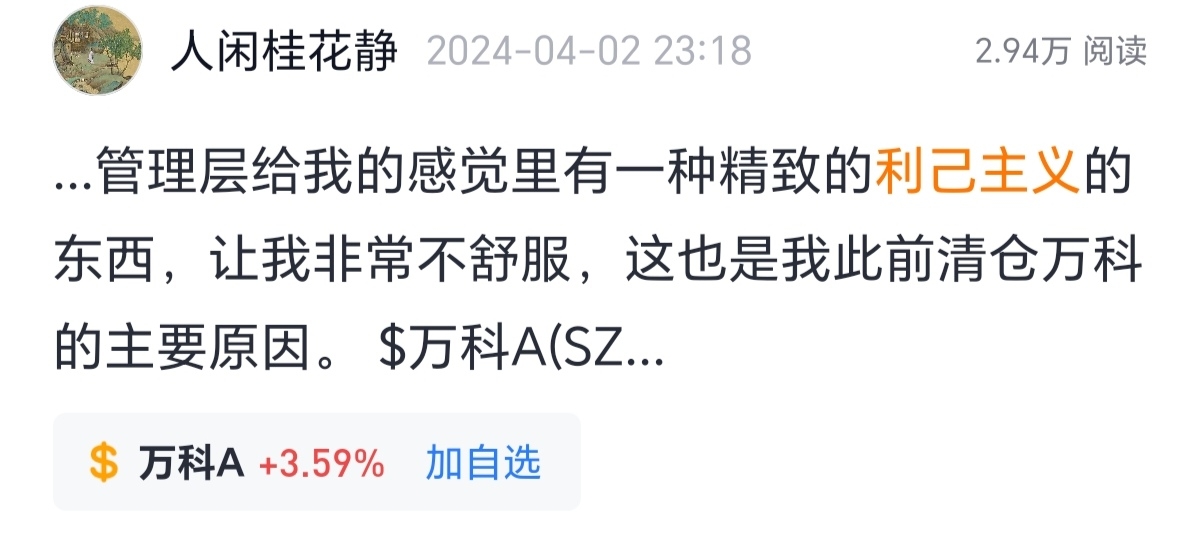 郁亮辞任了,公告中甚至连“感谢…对公司的贡献…”此类公告常见的该有的客套话都没有,人走茶凉。 突然想起两年前在雪球写的对万科管理层的评价,竟在这两年里得到了充分的验证。$万 科A(SZ000002)$$保利发展(SH600048)$$华润置地(HK|01109)$