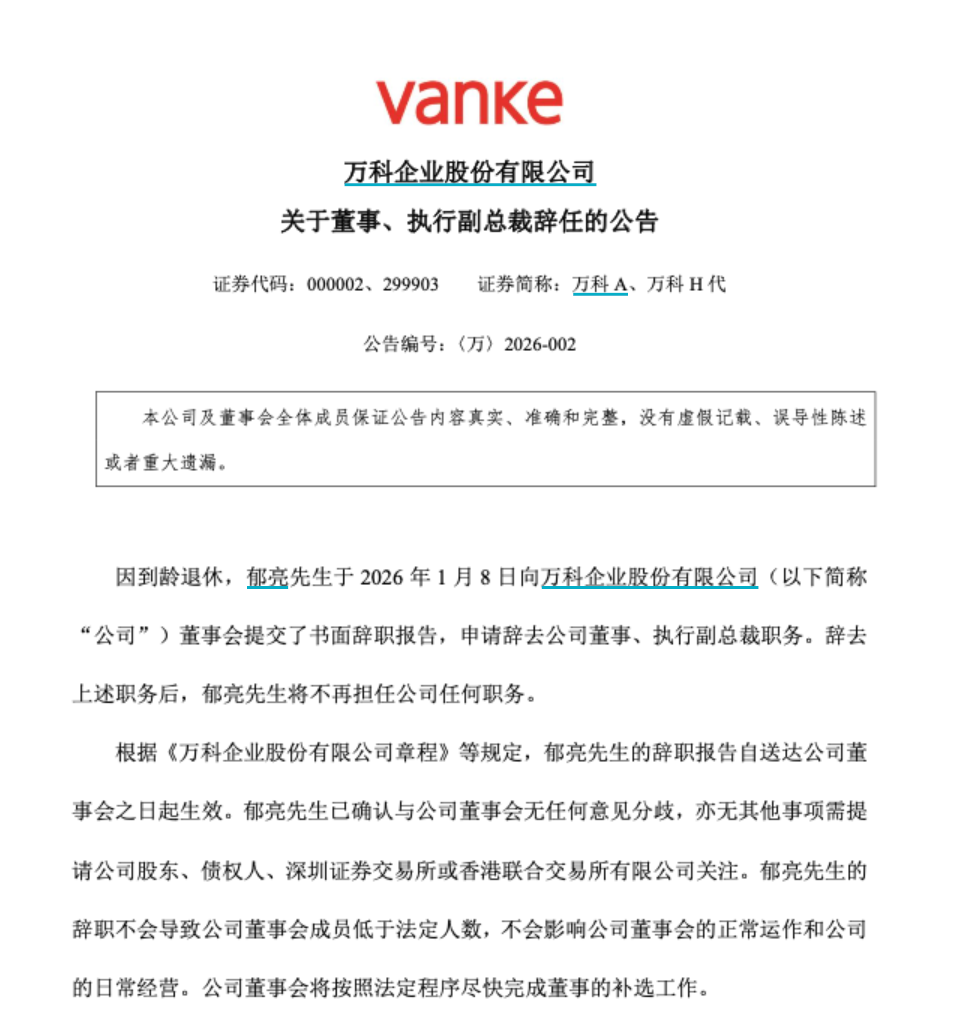 1月8日,万科发布公告称,因到龄退休,郁亮于2026年1月8日向公司董事会提交书面辞职报告,申请辞去公司董事、执行副总裁职务。辞去上述职务后,郁亮将不再担任公司任何职务。