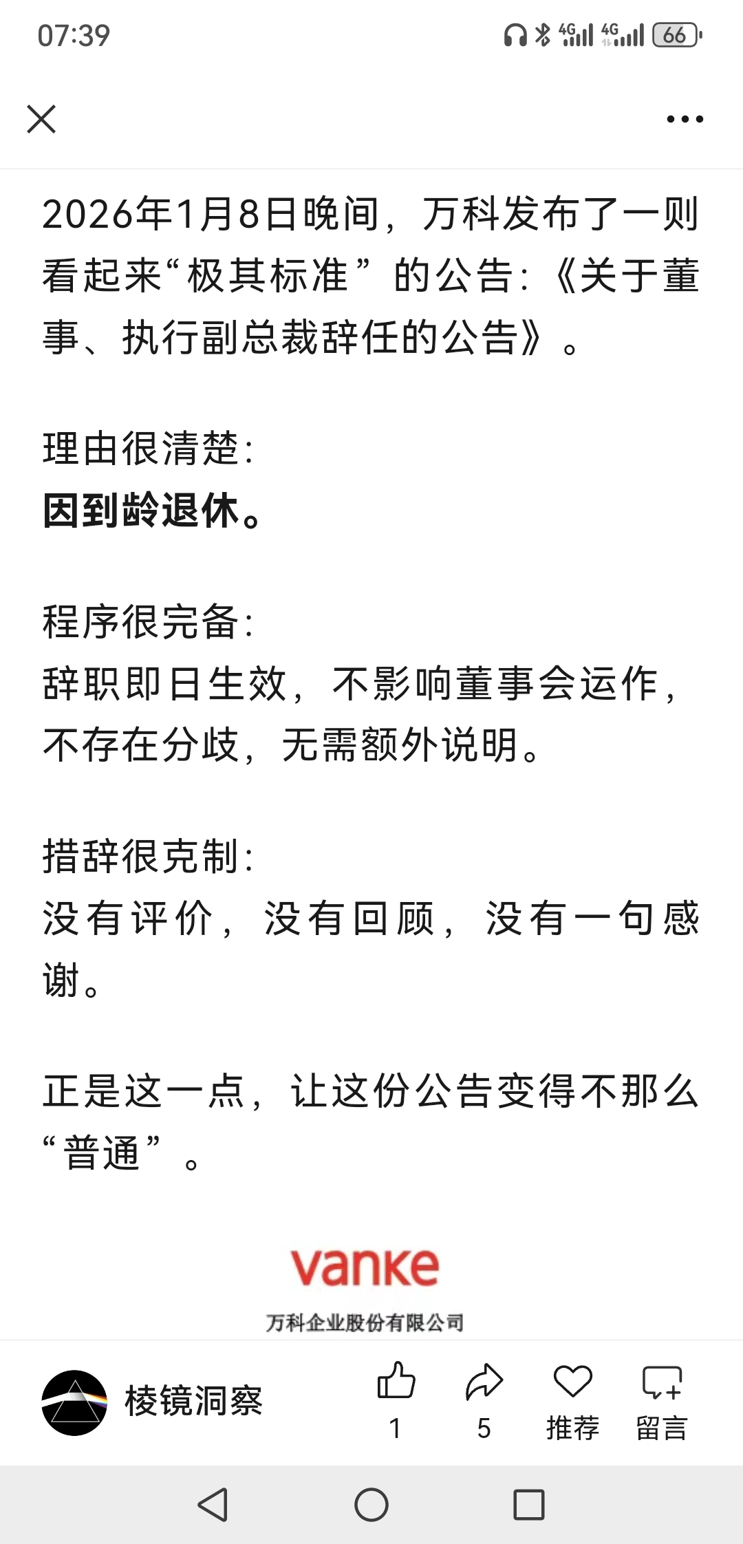 公告没有提及郁亮先生对公司做出的贡献表示感谢,应该不是疏漏。