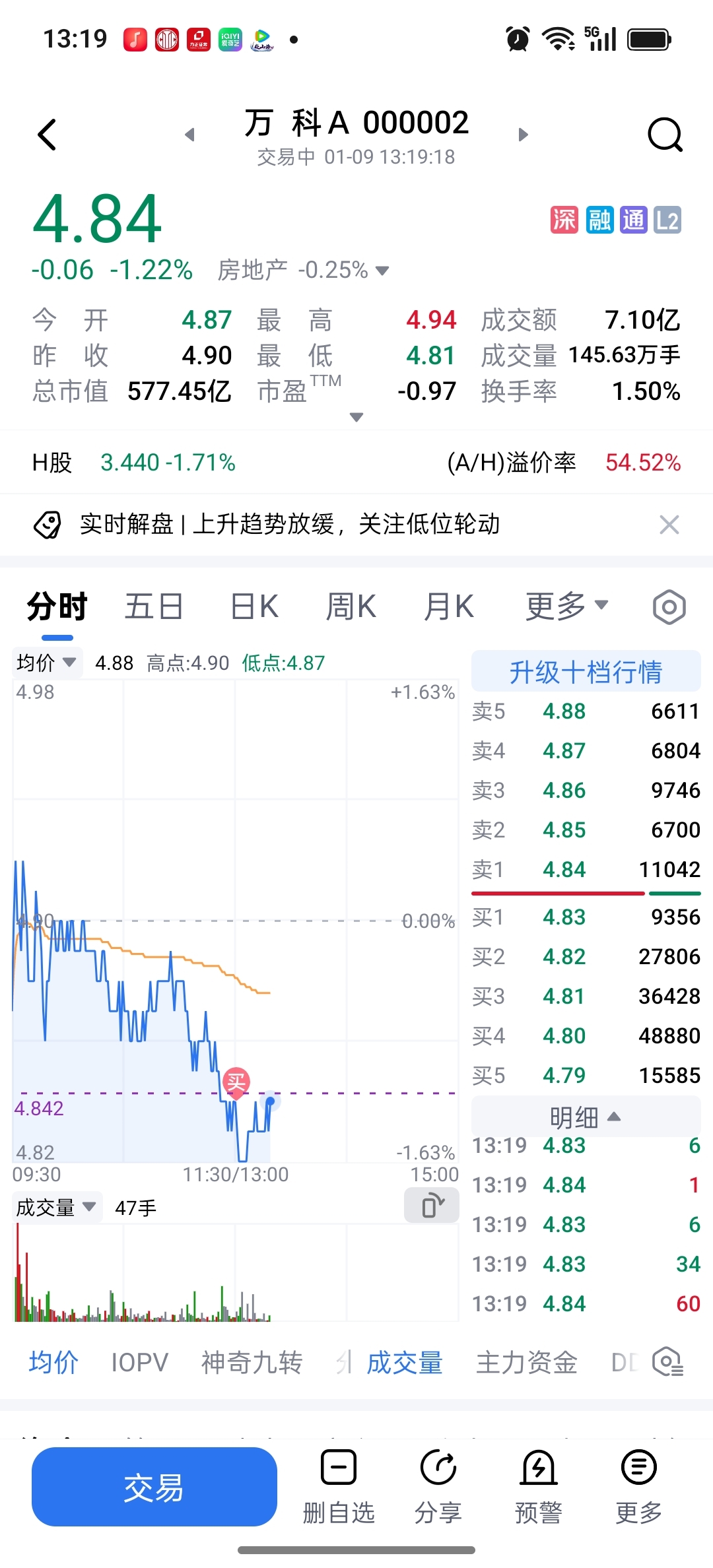 $万 科A(SZ000002)$ 4.84建了点底仓,主力不会套我吧?