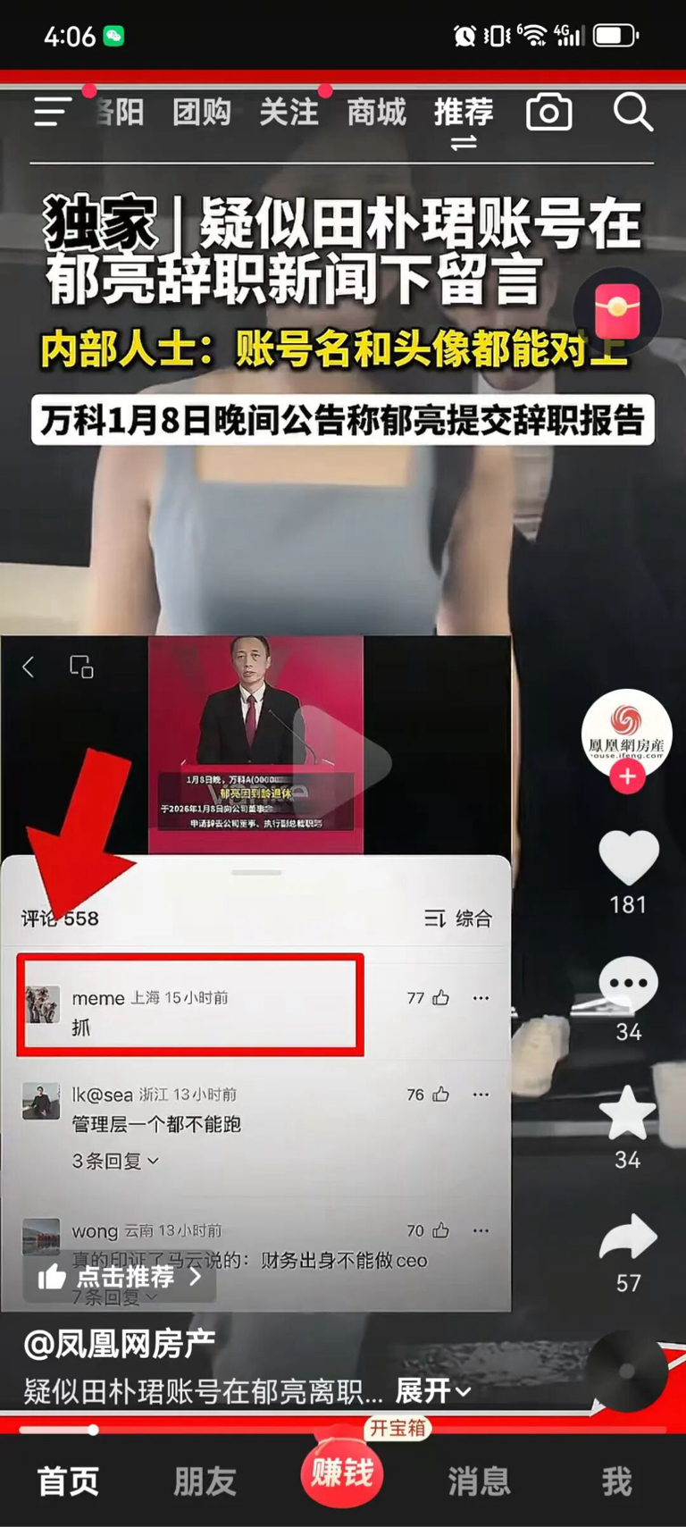 在此新闻下,一个疑似为田朴珺(万科创始人王石的妻子)的社交媒体账号发表了评论。该评论据称仅有一个字:“抓” 。部分分析认为,这个评论可能带有“别让他跑了”的暗示,信息量较大。由于田朴珺与王石的密切关系,有猜测认为这一评论可能在一定程度上反映了王石的态度或其所在圈层的看法。