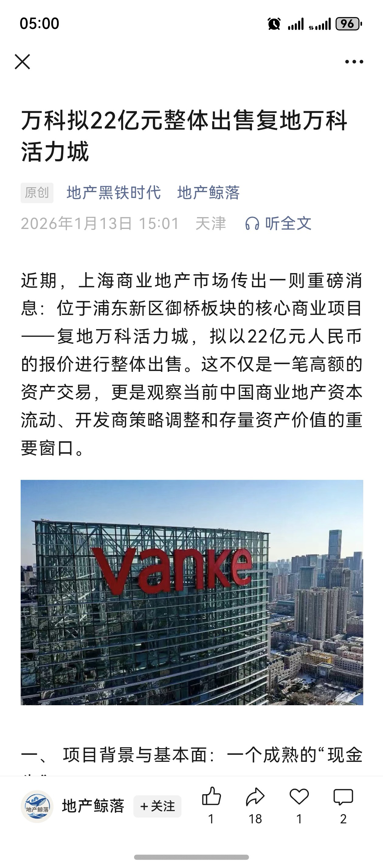 万科拟22亿元整体出售复地万科活力城原创地产黑铁时代地产鲸落2026年1月13日