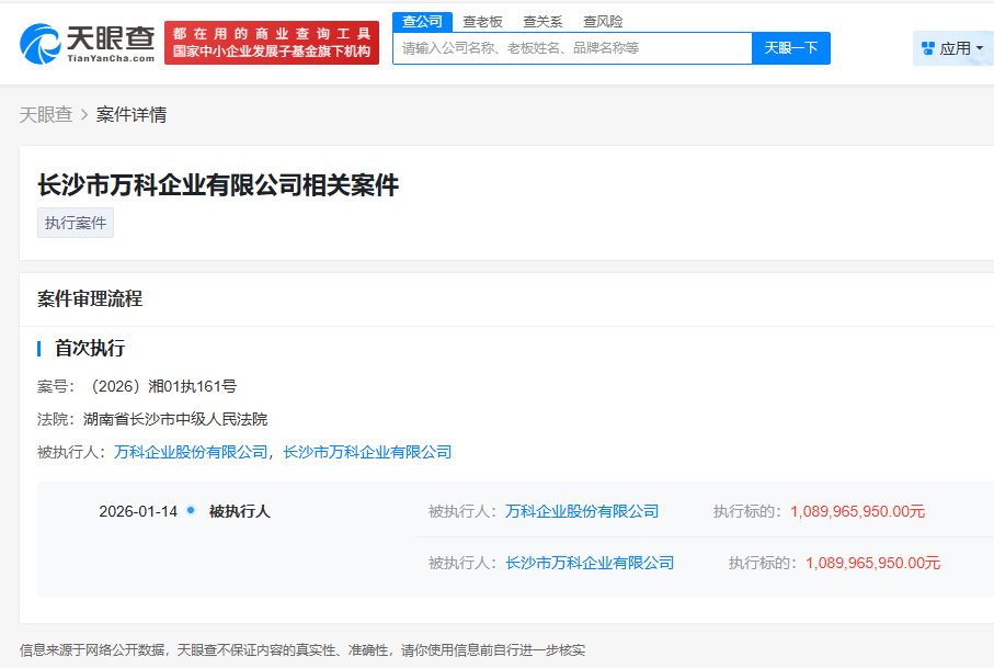 每经AI快讯,天眼查App显示,近日,万科企业股份有限公司、长沙市万科企业有限公司新增一则被执行人信息,执行标的大约10.90亿元,执行法院为湖南省长沙市中级人民法院。